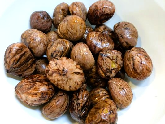 こうして、やっとこ全部の栗の鬼皮がむけたものの、渋皮が栗から剥がれてしまった部分があると煮ている途中で栗がホロけてしまうとのことだったので、渋皮が剥がれた部分が大きかった栗は分別して栗ご飯にして食べました。