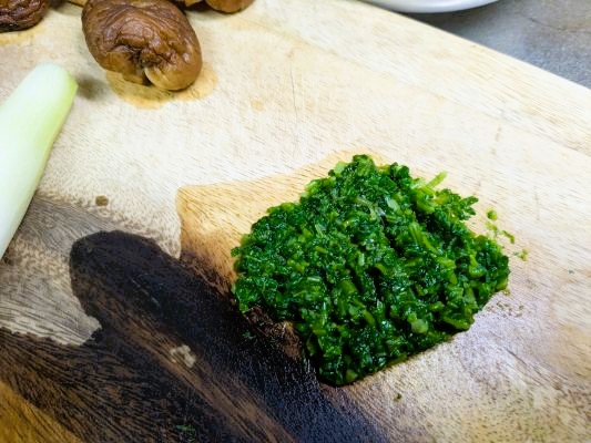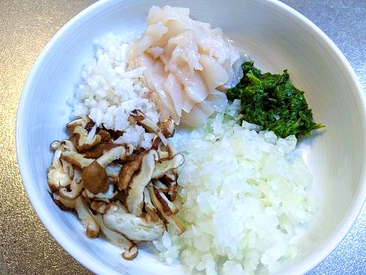 全ての七草・刺身用ホタテ・干し椎茸を細かく刻みます。