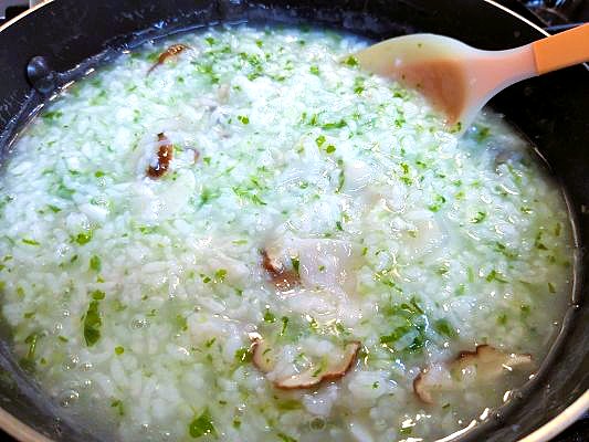 鍋で米をじっくり煮て先にお粥を作ってから、最後に刻んだ具を入れて混ぜ合わせて。