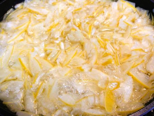 皮をスライサーで薄くスライスして、3度ほど煮てアク抜きをしてから、水少々と砂糖を加えて煮詰めて完成です。