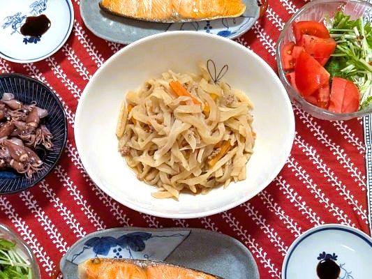 ごぼうは水でもどしてすぐにきんぴらが作れるように細切りに。