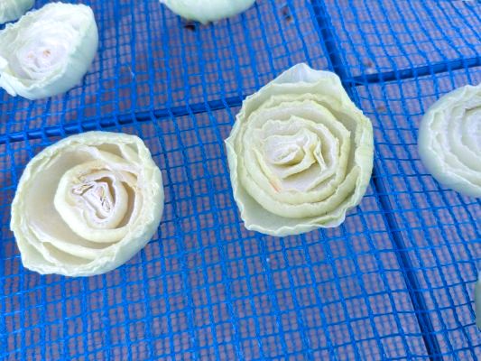 あ、いきなり余談ですが、小ぶりの玉ねぎをスライスして干していたら、乾燥してシワシワしてきて、なんかちょっと白いバラのようになってきました!