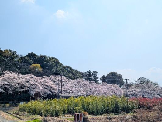 そして、見沼田んぼの桜回廊は本当に桜回廊が果てしなく続いているので、ちょっと畑側に入って外から桜回廊を見ると、こんな美しい景色となっています。