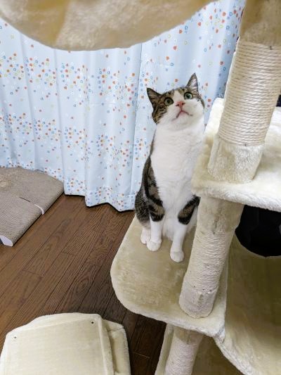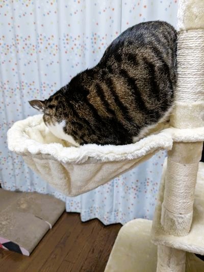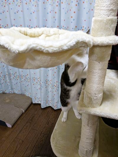 このキャットタワーの大きさや形は、猫くんにとっては「勝手知ったる我が家」みたいなものみたいで、何の抵抗もなさそうです。
