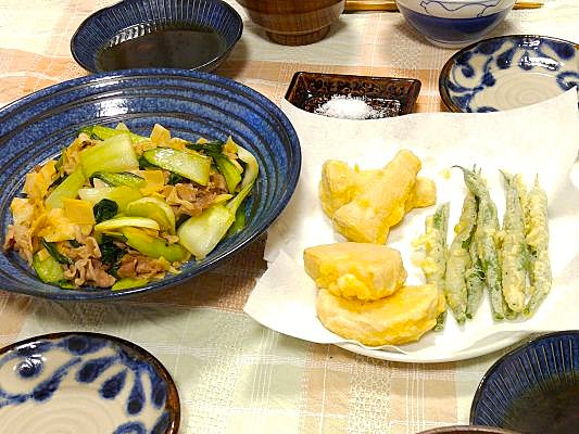 「姫皮の中華炒め」と「天麩羅」
