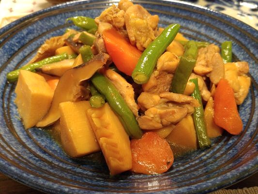 筍の根元から中央部までをちょっと贅沢に大きくカットしてゴロゴロ入れまして、鶏肉と人参と干し椎茸といんげんと一緒に煮ました。