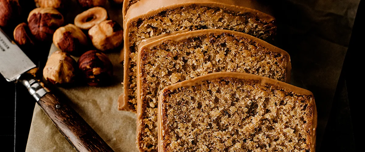 焙煎によりヘーゼルナッツの力強い香ばしさと深いコクを引き出した”ジャンドゥーヤ”を生地に練り込んで焼き上げた優しいパウンドケーキ。