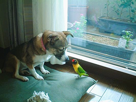 先輩のキエリクロボタンインコが遠慮なく近づいて行っても。